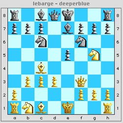 10. Bxf7+ (?? il fallait en profiter par Nxg7 !! fourchette et prendre la tour) Kf8 11. b4 (? perte de temps.Mieux vaut éviter de jouer trop de pions) Bg4 12. Qg3 h6 (? trop tot : préparer d'abord l'attaque du cavalier avec dame en d6) 13. Ne6+ Bxe6 14. Bxe6 Qd6 (trop tard) 15. Bc4 (les noirs ont une avance de développement et les blancs devraient réagir) a6 16. Qg6 (Pour viser encore f7 et le mat. Les blancs exploitent la faiblesse des noirs sur les cases blanches) Nd8 (seul coup) 17. O-O b5 18. Bb3 Ne6 19. Nd2 (avantage des blancs avec la paire de fous. f7 reste fragile, il faut l'exploiter) Nd5 (vise f4 ?) 20. Ne4 (! indélogeable et menace la dame et le cavalier) Qc6 21. c4 Ndf4 22. Qf5+ Kg8 (Attention, le cavalier en e6 va être en danger) 23. cxb5 (eh hop, le cavalier en e6 est bloqué par le fou b3!) axb5 24. d4 (!? vous avez vu le piège ?)