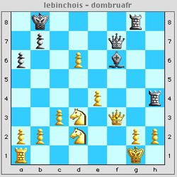 29...Bd4+ (?? Le tournant de la partie : un bien mauvais sacrifice du fou, poussant à l'échange des dames...et les noirs se retrouvent avec une pièce et des pions de moins, avec en face une paire de cavalier meurtrière ! Dame en e6 par exemple était bien plus intéressant car menaçait h2 et prenait d6) 30. cxd4 Qxf3 31. Nxf3 Rxe4 32. Re1 Reg4 33. Re2 Kc8 34. d5 Kd7 35. Nfe5+ (on rend la fourchette !) Kxd6 36. Nxg4 Rxg4 37. Ne5 Rd4 38. h4 (? trop rapide) Rxh4 39. Ng6 (menace la tour noire et vise e7) Rd4 40. Ne7 (protège le pion) b5 41. Re6+ Kd7 42. Re5 Rd2 43. Nf5 Rxb2 (les noirs récupèrent des pions) 44. Re7+ Kd8 45. a3 Ra2 46. g4 (! un pion qui va faire très mal...) Rxa3 47. Kf2 Rd3 48. Re5 b4 49. Ke2 Rh3 50. Re7 Ra3 51. g5 b3 52. g6 b2 53. g7 Rg3 (!!!) 54. Rb7 (! seul coup pour empêcher g8=dame et mat, mais ce n'est qu'un sursis) Rg2+ 55. Kf3 b1=Q 56. Rxb1 Rd2 57. g8=Q+ Kd7
