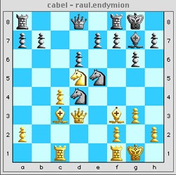 9. Nc3 (?? erreur ! Qb3 etait plus interessant) Qxb2 10. Rc1 (Nb5 etait interessant pour la fourchette et pour proteger d4 - olivier : et le roque? avec la colonne b ouverte c'est dangereux) Nh6 11. O-O Nf5 12. Rc2 Qb4 13. Nd5 Qa5 14. Bd2 Qd8 15. Bc3 Nfxd4 (encore un pion de moins) 16. Rc1 (une seule case pour la tour) O-O 17. Qd3 Bxf3 18. Bxf3 Ne5 ! (quel pseudo sacrifice !! si Qxd4 Nxf3 regagne la dame !)