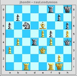 16. Kh2 (? coup de roi inattendu! John ne voulait pas jouer Ng5, car il savait que c'était ce qu'on voulait!) h6 17. a3 Be7 18. b4 Qd8 19. Nbd2 f6 20. Nb3 f5 21. Bf4 Nf7 22. Rac1 Bg5 23. Bxg5 Nxg5 24. Nxg5 Qxg5 25. Nc5 Rc7 26. f4 Qh4+ 27. Kg1 Nd8 28. Nxd7 Rxd7 29. c4 Nc6 30. cxd5 Rxd5 31. Bc4 Rd4 32. Bxe6+ Kh8 33. Qe3 (! un piège..et le tournant de la partie)