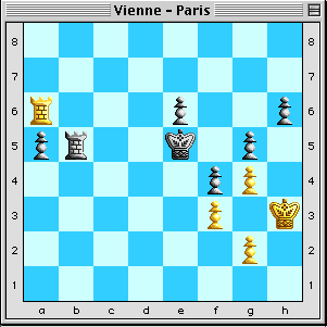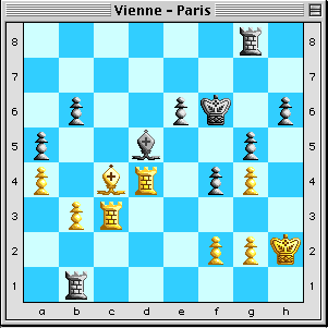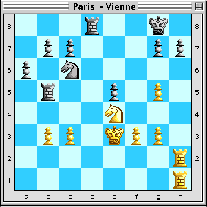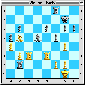 60... Rb5 61. Ra6 Ke5 Les Blancs abandonnent. Vienne a envoye le coup 62. Kh3 et presqu'en meme temps est arrivee a Paris la proposition d'annuler le match par l'abandon d'une partie par chaque camp.